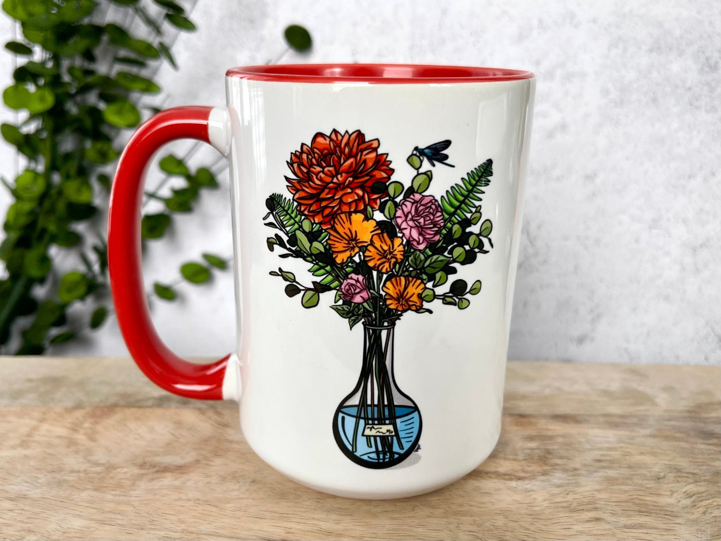 This is a solid ceramic 15 oz mug with my science flask full of flowers digital painting on it. Perfect gift for a scientist, teacher, chemist, engineer - anyone that loves STEM or women in science. It’s got Red Dahlia, Pink Roses, Eucalyptus, California Poppies, and Ferns.