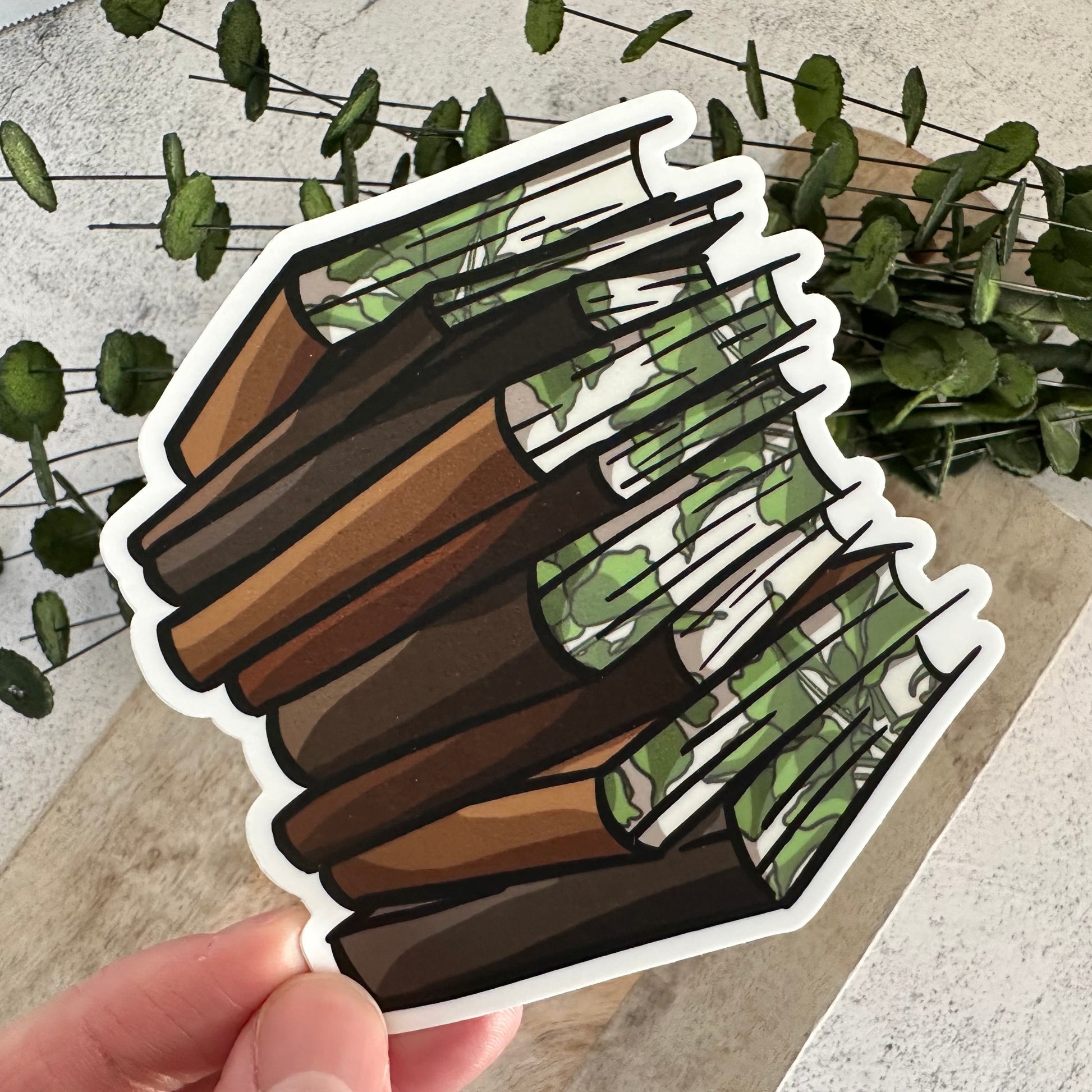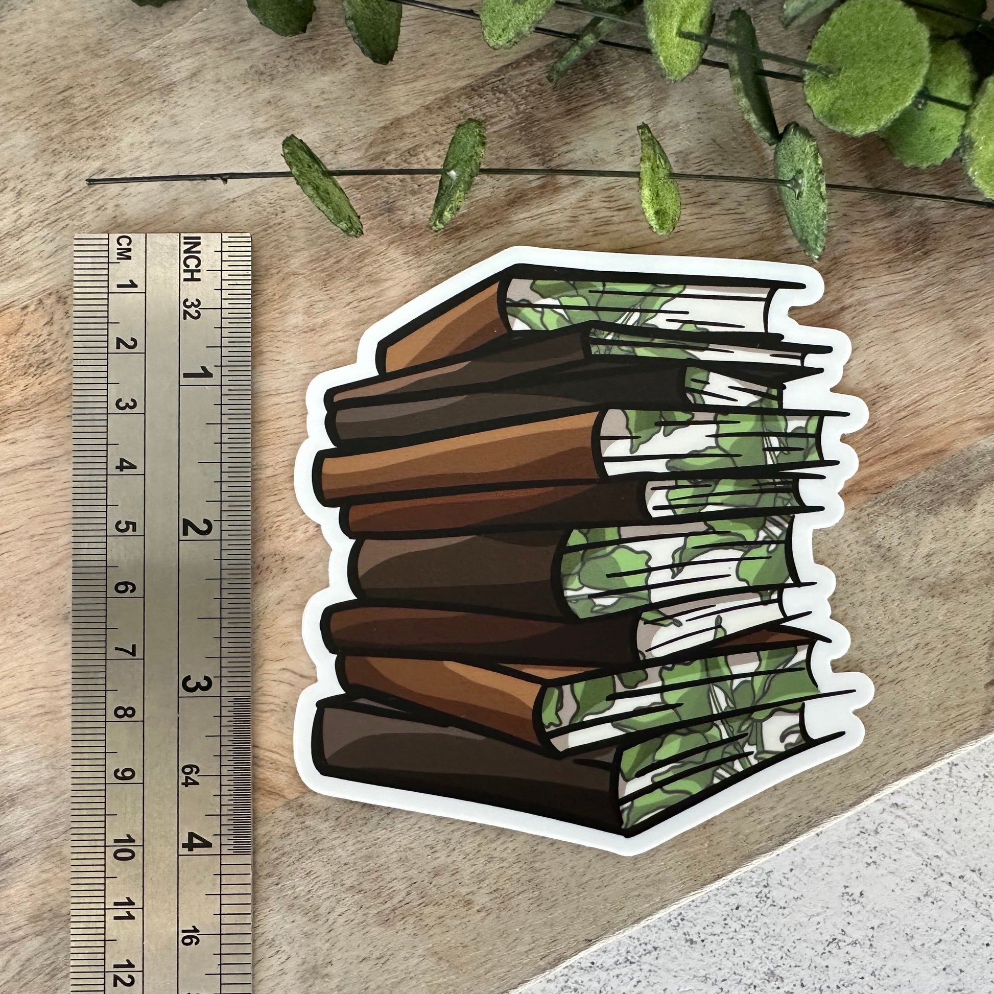 This is a sticker of my stack of books with fore-edge painting digital design. Brown earth toned spine with green Pothos leaves. This would be a perfect gift for any book lover. Great for putting on kindles, laptops, e-readers, water bottles - anywhere your favorite reader wants.