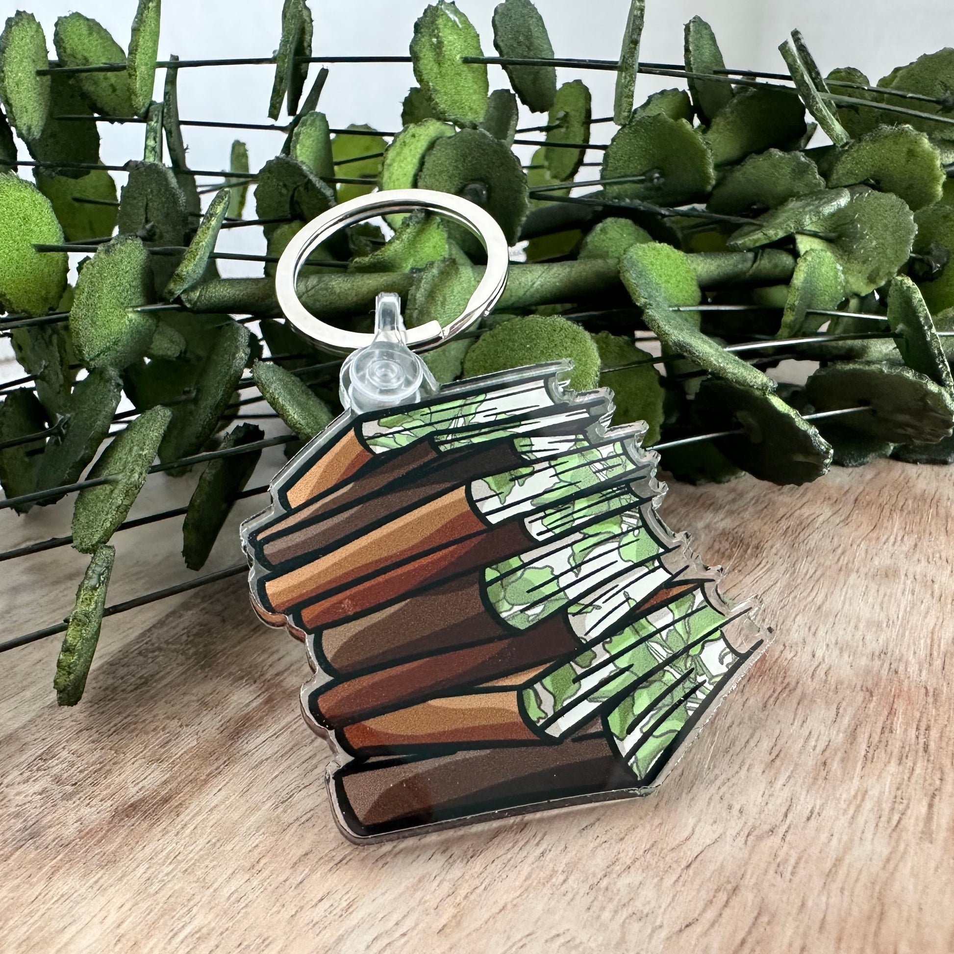 This is an Acrylic keychain of my stack of books with fore-edge painting digital design. Brown earth toned spine with green Pothos leaves. This would be a perfect gift for any book lover.