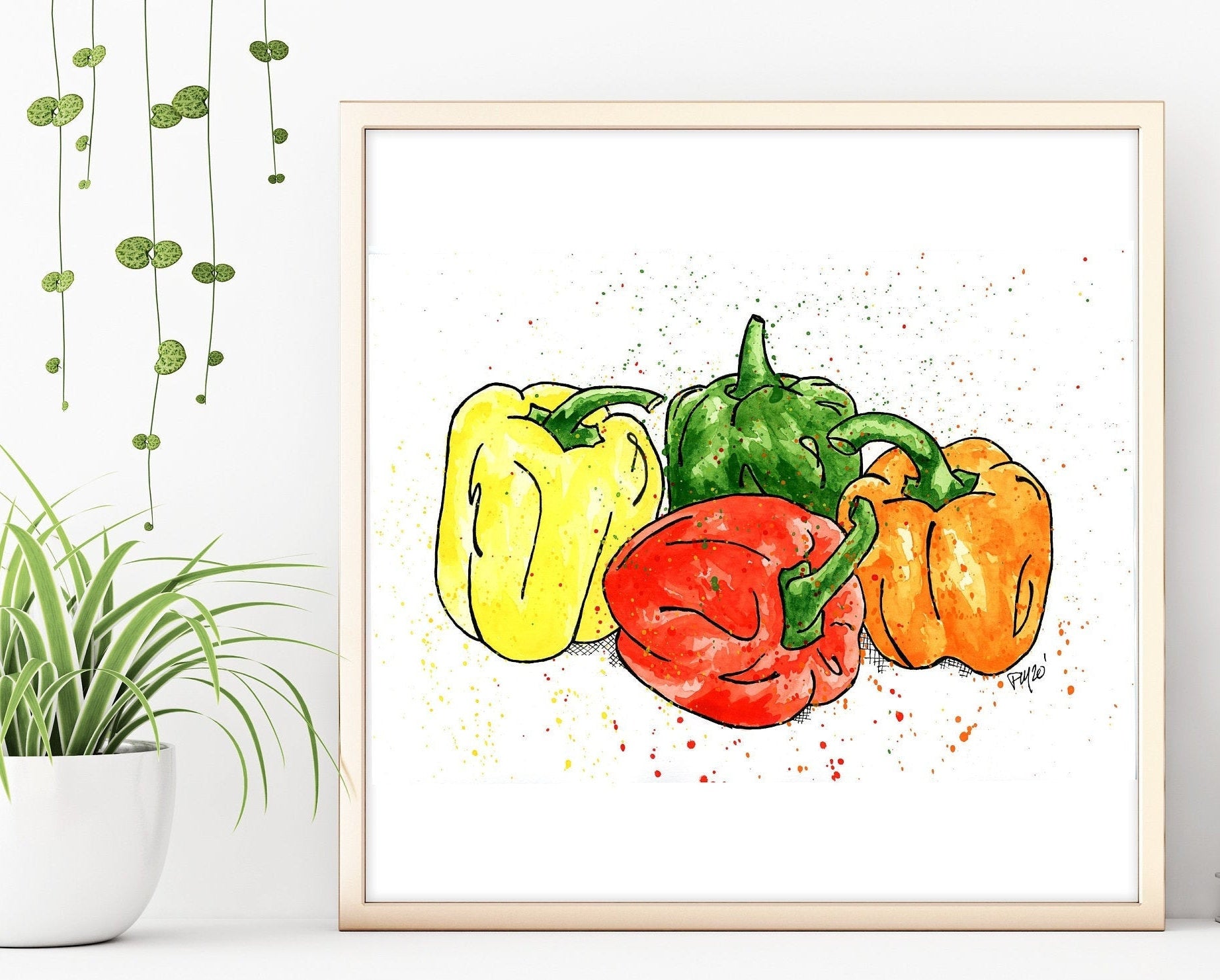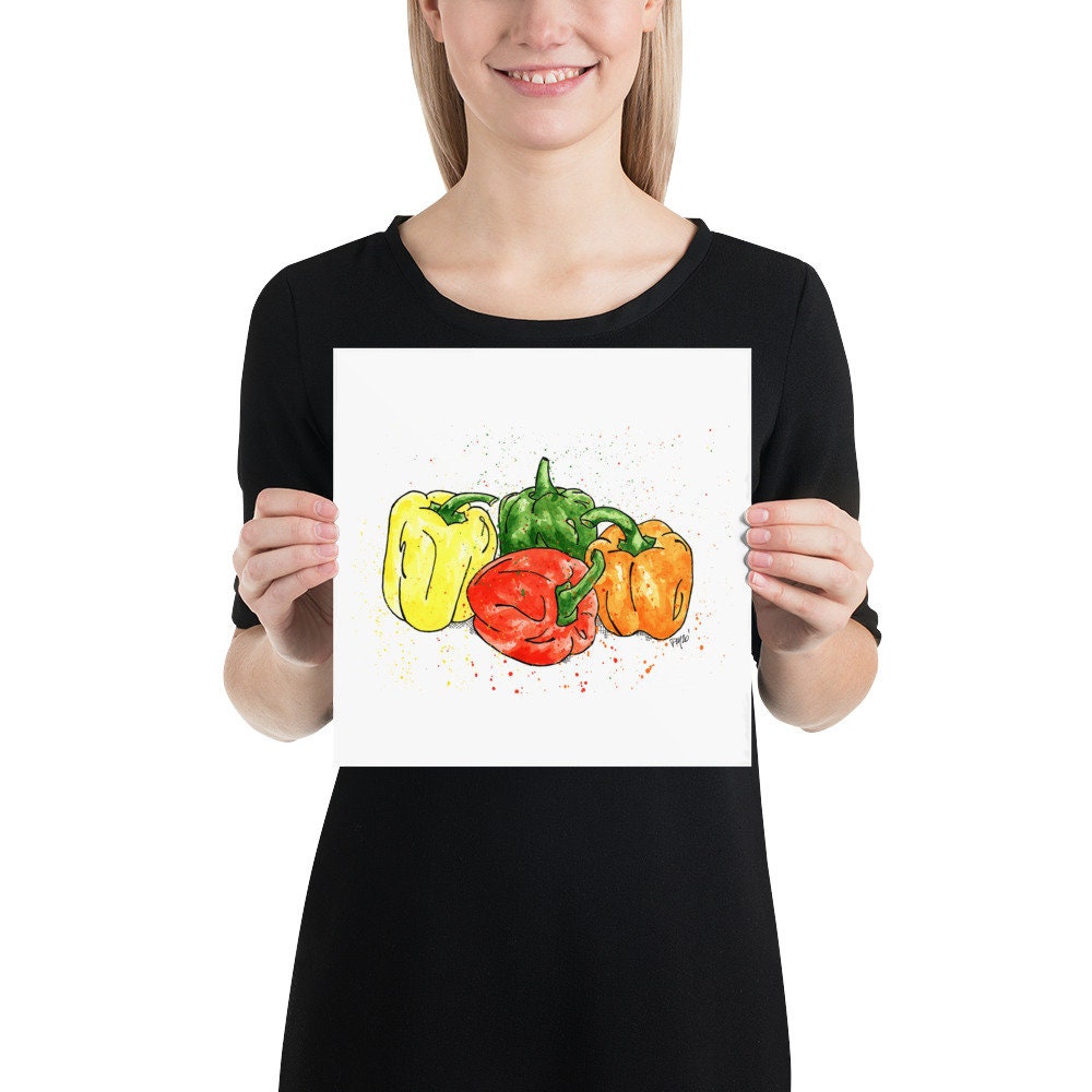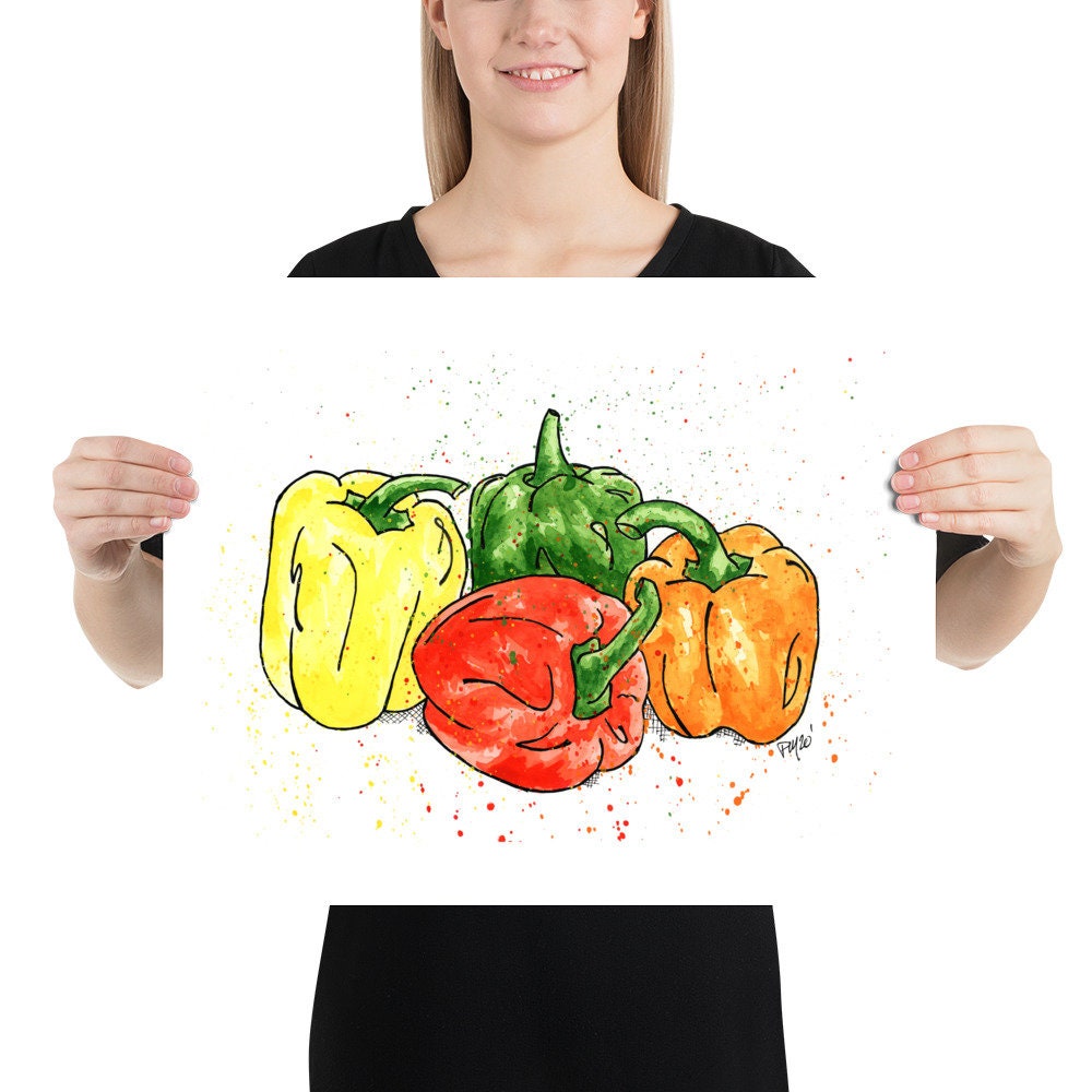 This is a physical print of a my hand painted Colorful Bell Pepper Vegetable watercolor and ink painting!