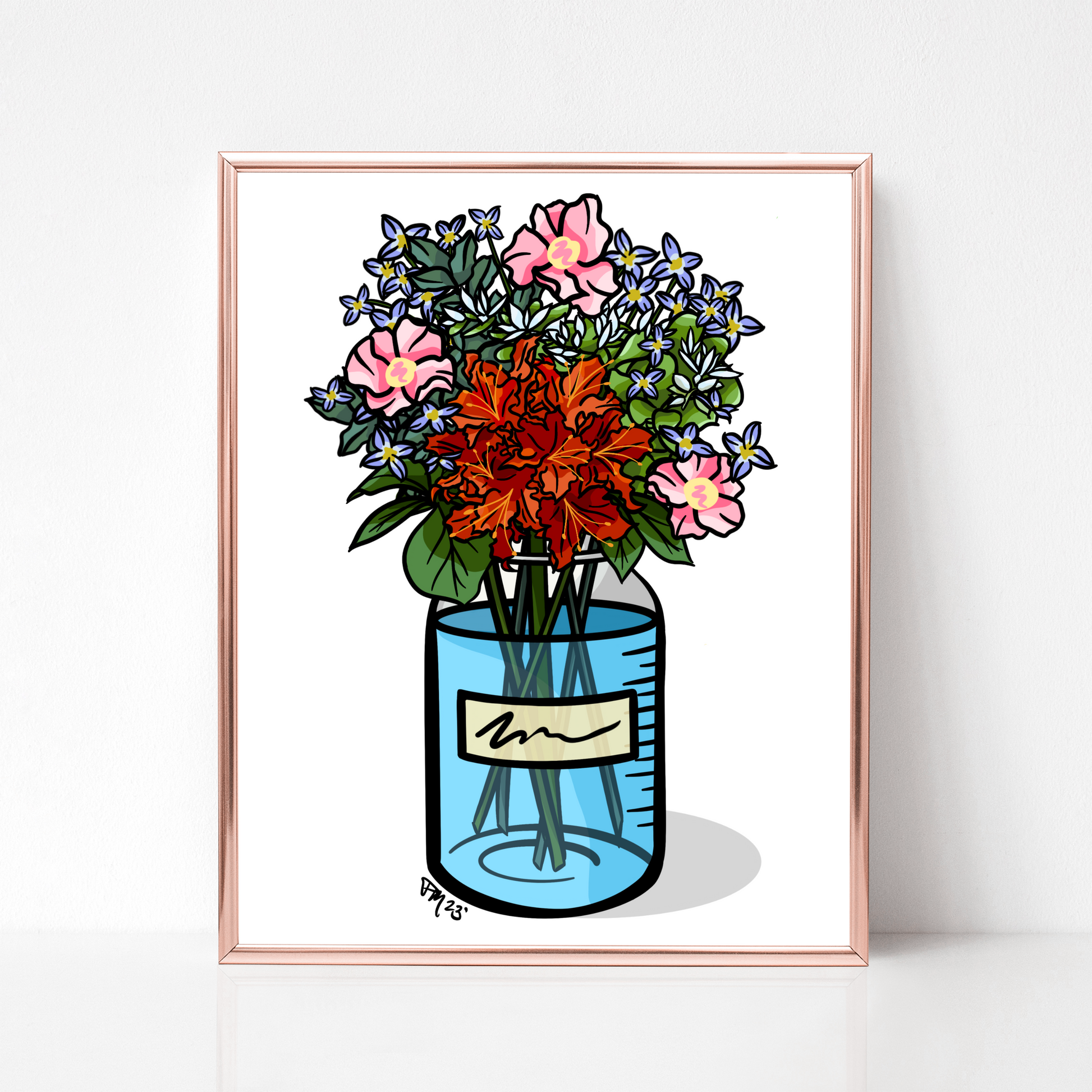 This is a physical print of a my Flask Bouquet digital painting! This bouquet is completed with Flame Azalea, Mountain Stonecrop, North Carolina Roses, and Creeping Bluet - all local Appalachia / North Carolina Mountain plants. I try to make art that's colorful and happy. If you have a gardener in your family I'm sure these would make them smile. These would also be perfect for any kid's room if it looks like you've got a budding scientist on your hands!