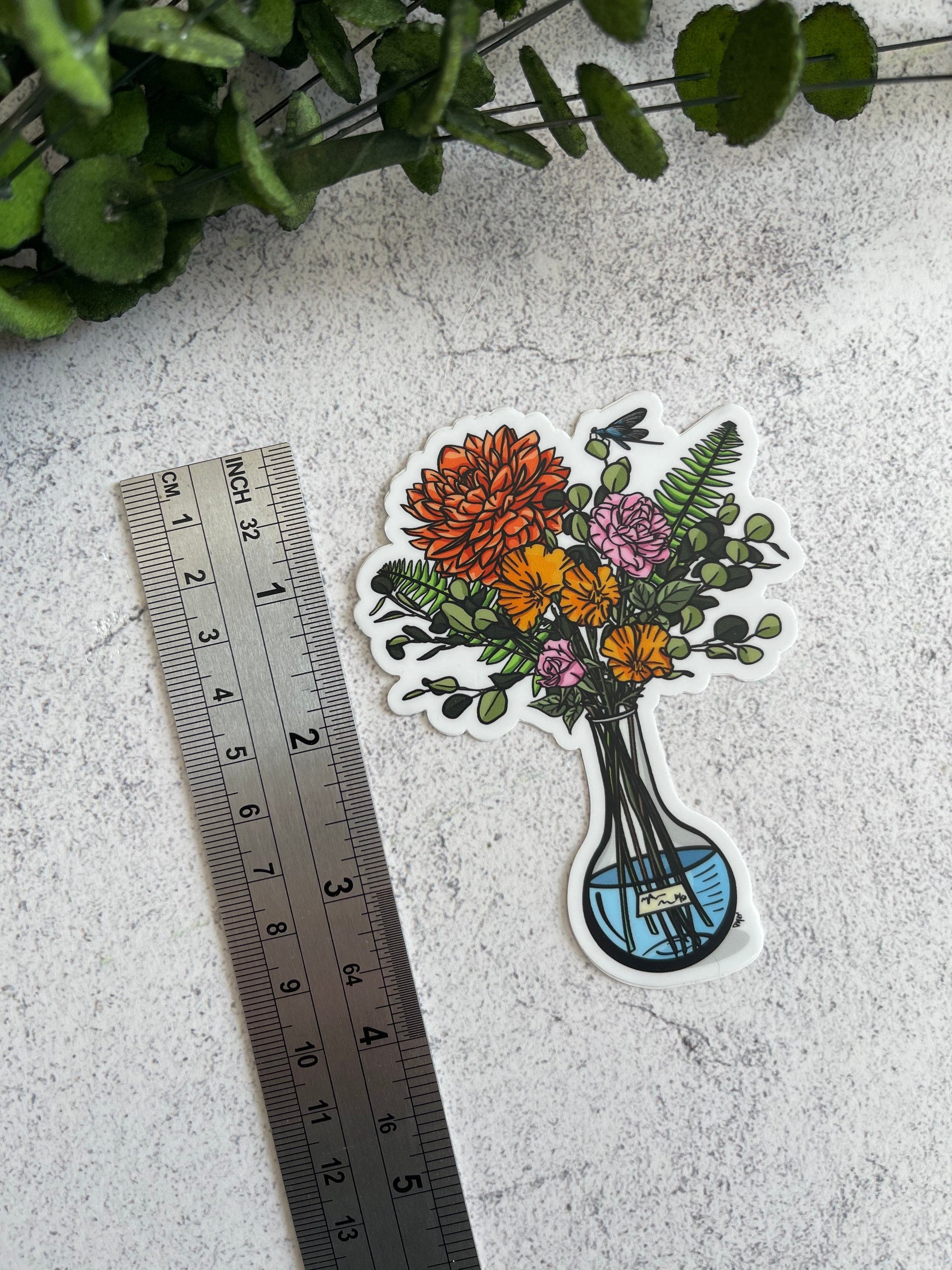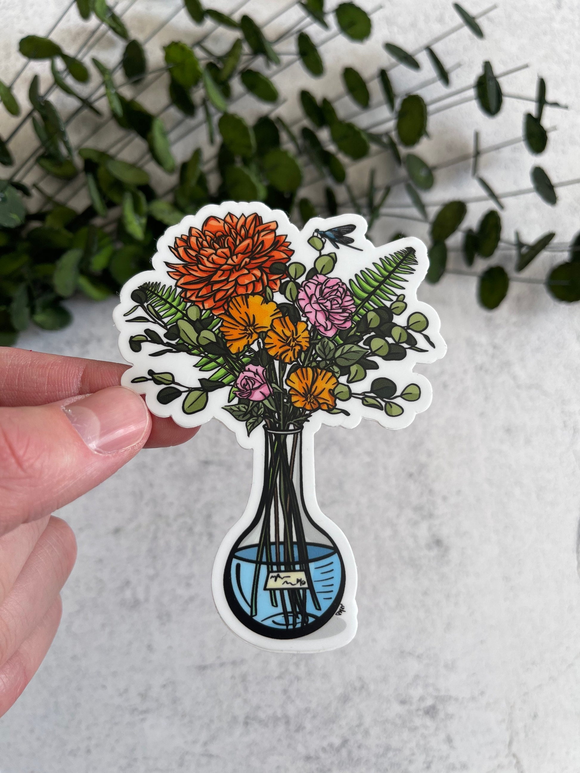 This is a sticker of my digital painting including an Erlenmeyer Flask filled with Red Dahlia, Pink Roses, Eucalyptus, California Poppies, and Ferns! If you`re a gardener, just love flowers or a scientist (or all of this combined!), this sticker is for you! This is part of my Women in Science Collection, and there are a few others available in the set.