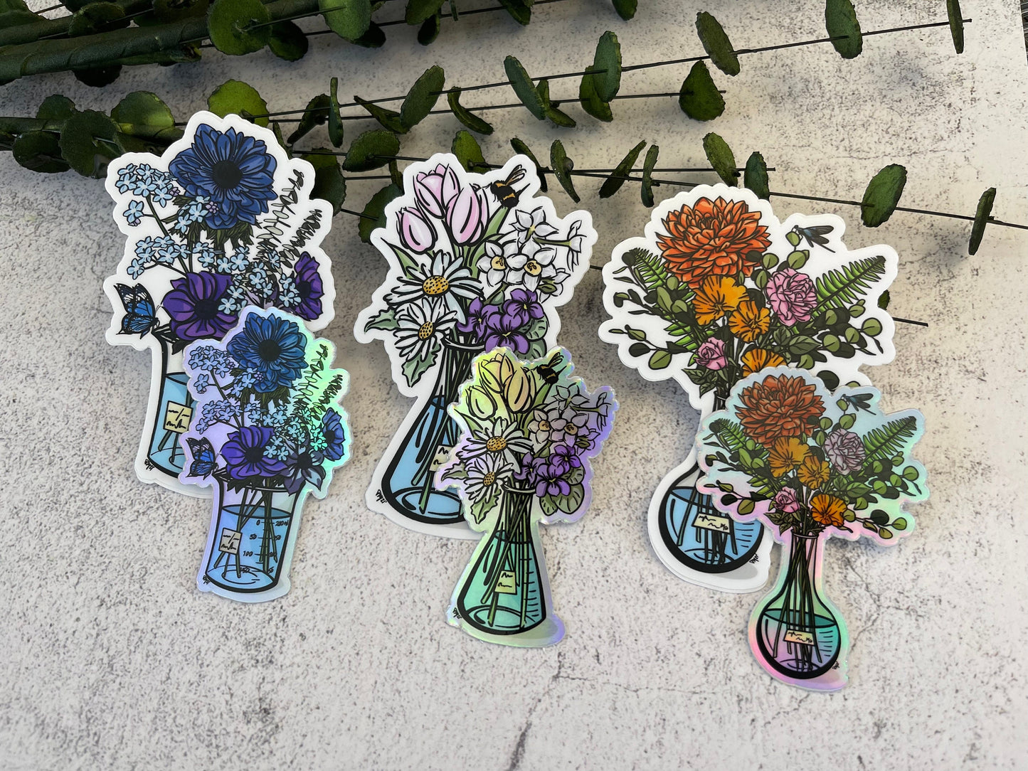 This is a flower sticker set of my series of digital paintings including Erlenmeyer Flasks filled with various flowers. The first flask is filled with Forget Me Nots, Purple Anemones, Eucalyptus, and a Blue Dahlia. The second flask is filled with Pink Tulips, African Violets, Daisies and Paperwhites. The third flask is filled with Red Dahlia, Pink Roses, Eucalyptus, California Poppies, and Ferns. If you`re a gardener, just love flowers or a scientist (or all of this combined!), this sticker is for you! This is part of my Women in Science Collection, and there are a few others available in the set.