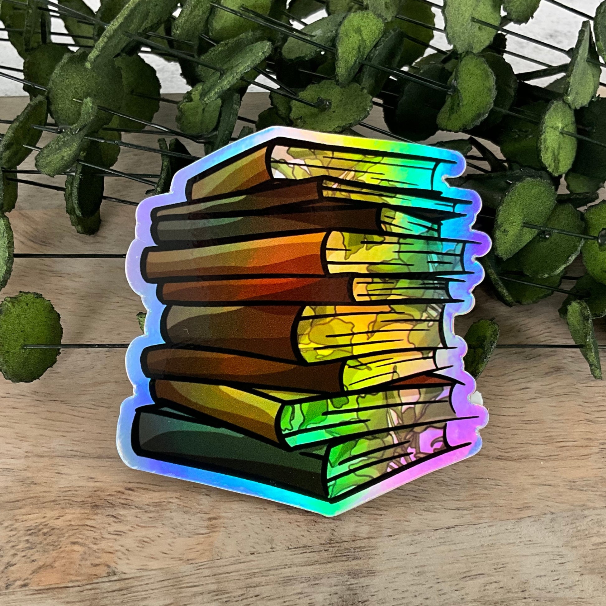 This is a sticker of my holographic stack of books with fore-edge painting digital design. Brown earth toned spine with green Pothos leaves. This would be a perfect gift for any book lover. Great for putting on kindles, laptops, e-readers, water bottles - anywhere your favorite reader wants.