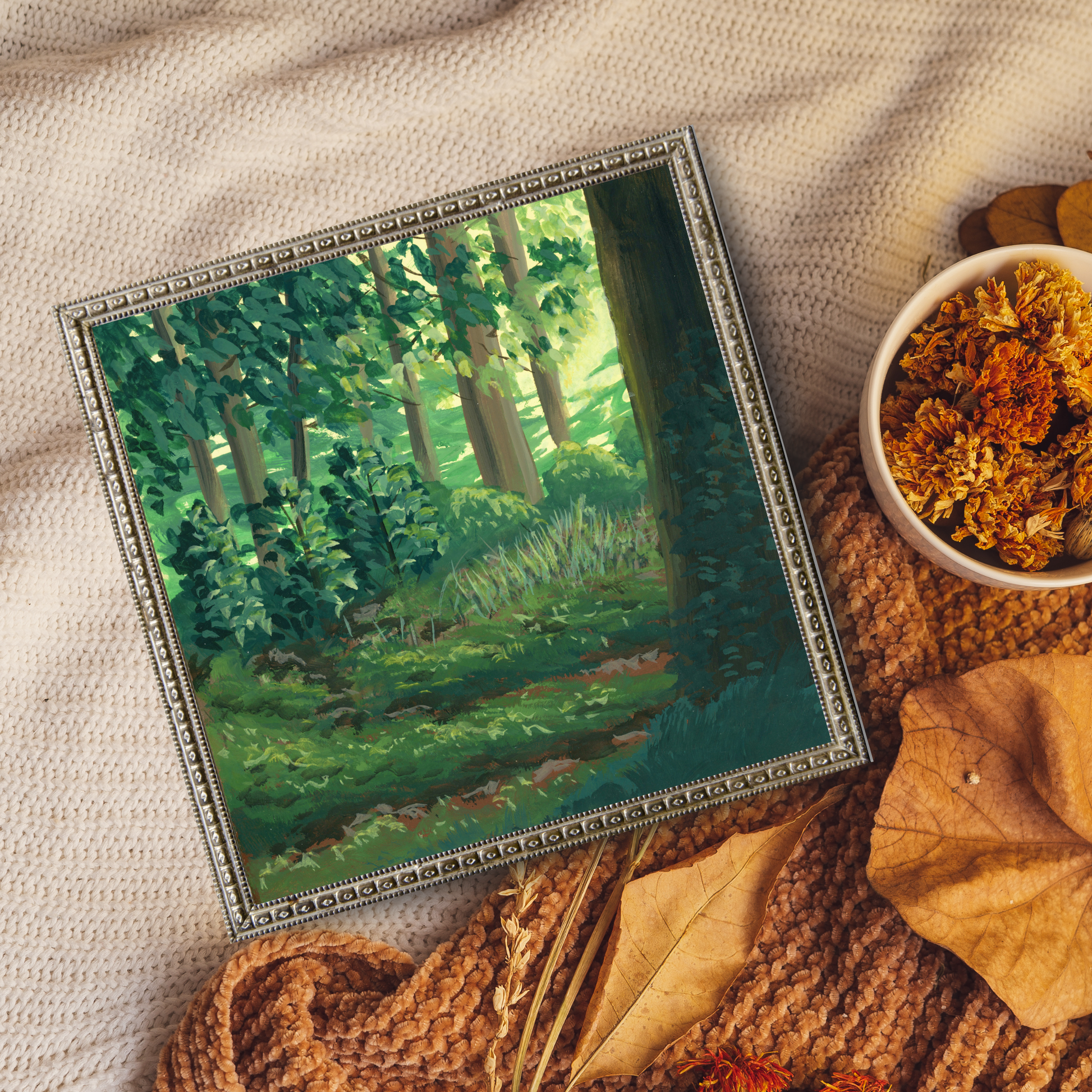 This is a Giclee Fine Art print of my hand painted gouache landscape "Mossy Forest Floor" Warm light spilling into a forest clearing to show a textured moss covered floor.