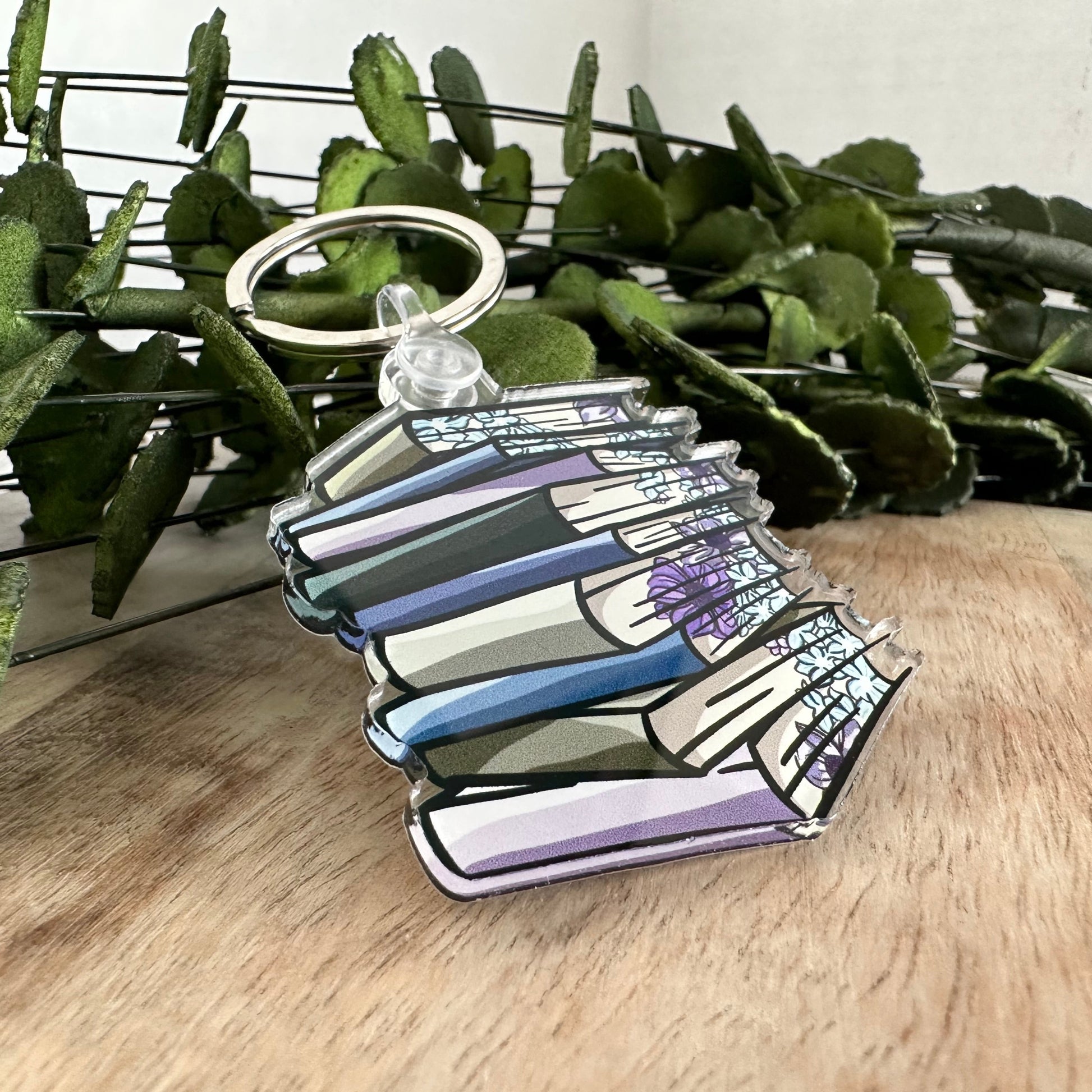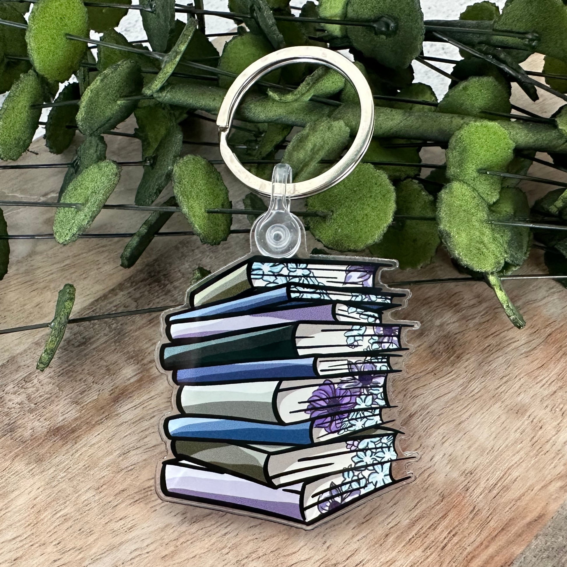 This is an Acrylic keychain of my stack of books with fore-edge painting digital design. Soft purple, blue, and green book spines with purple anemones and blue forget-me-nots. This would be a perfect gift for any book lover.