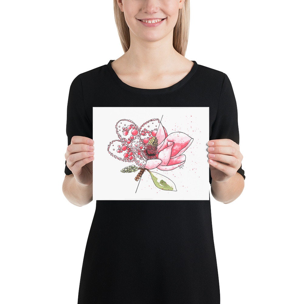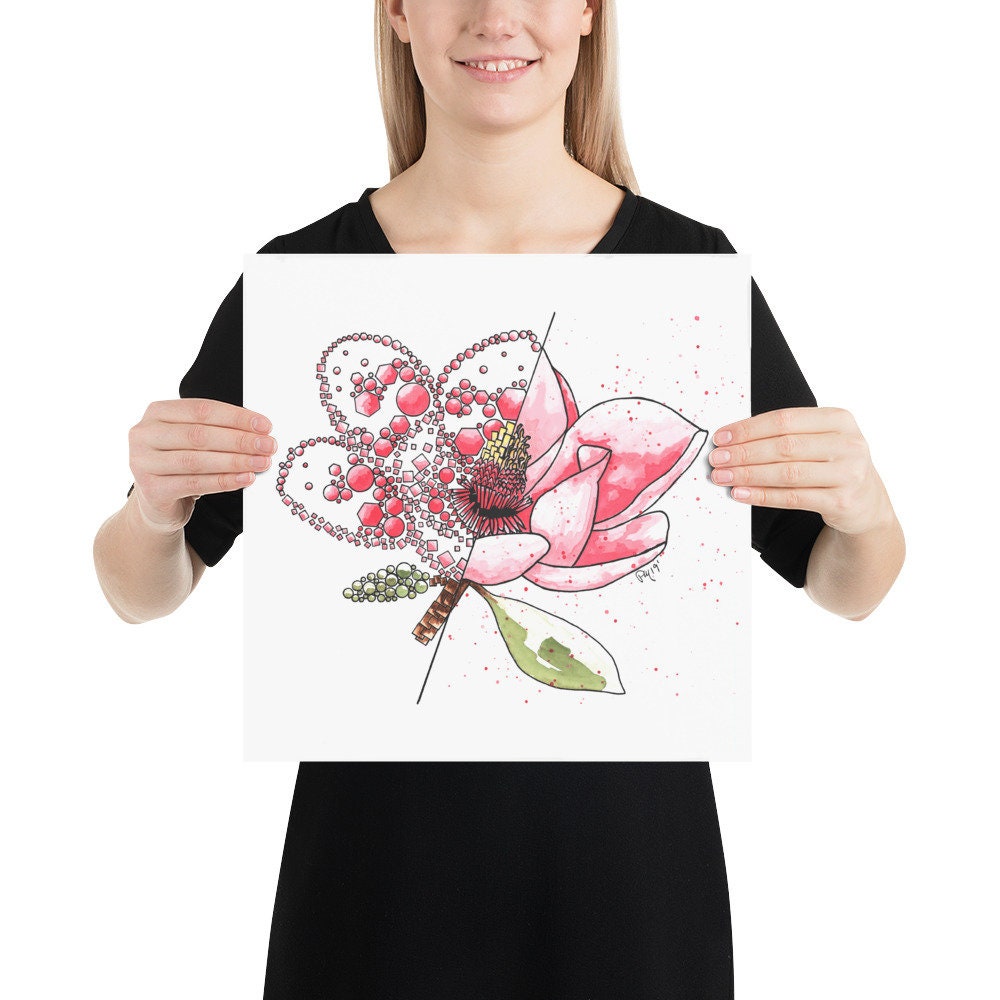 This is a physical print of a my hand painted Pink Magnolia Split Geometric watercolor and ink painting!