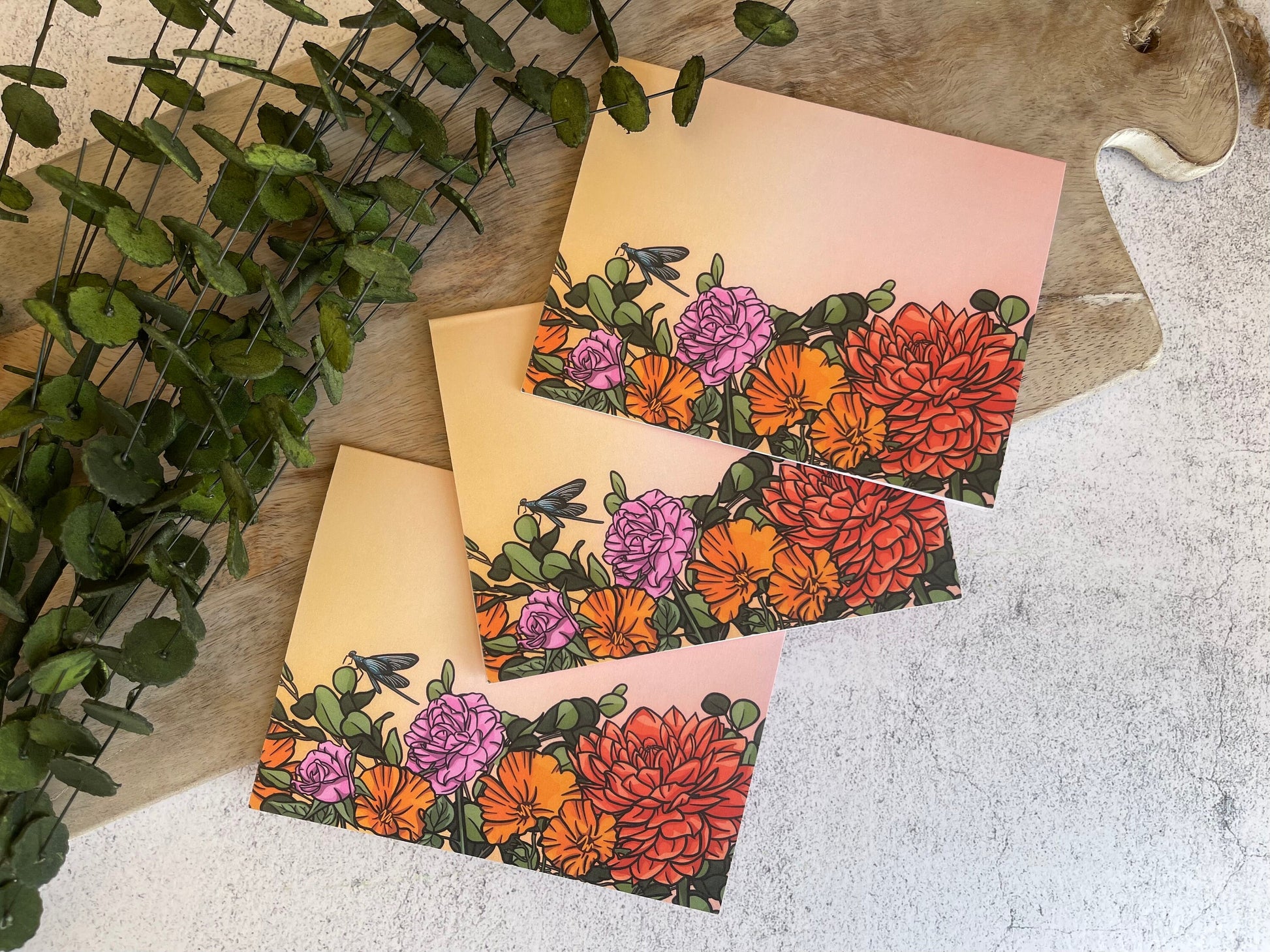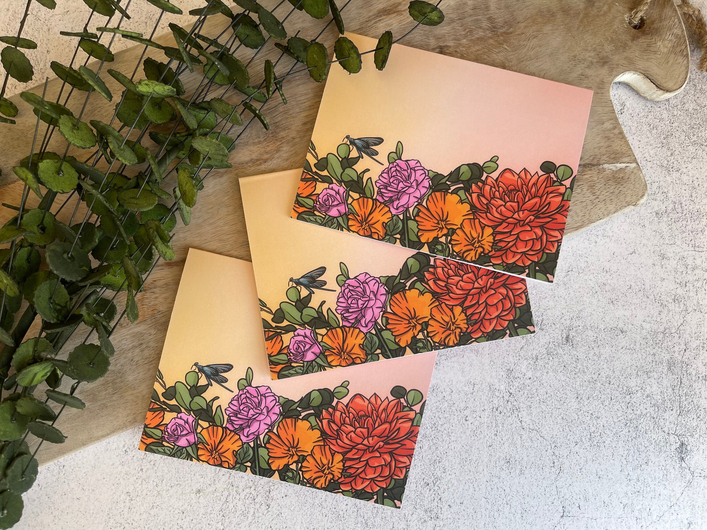 This is a single red floral greeting card! This card contains California Poppies, Pink Roses, Ferns, Eucalyptus, Red Dahlia, and a Lucky Blue Dragonfly. They are blank inside so they can be used for any occasion.