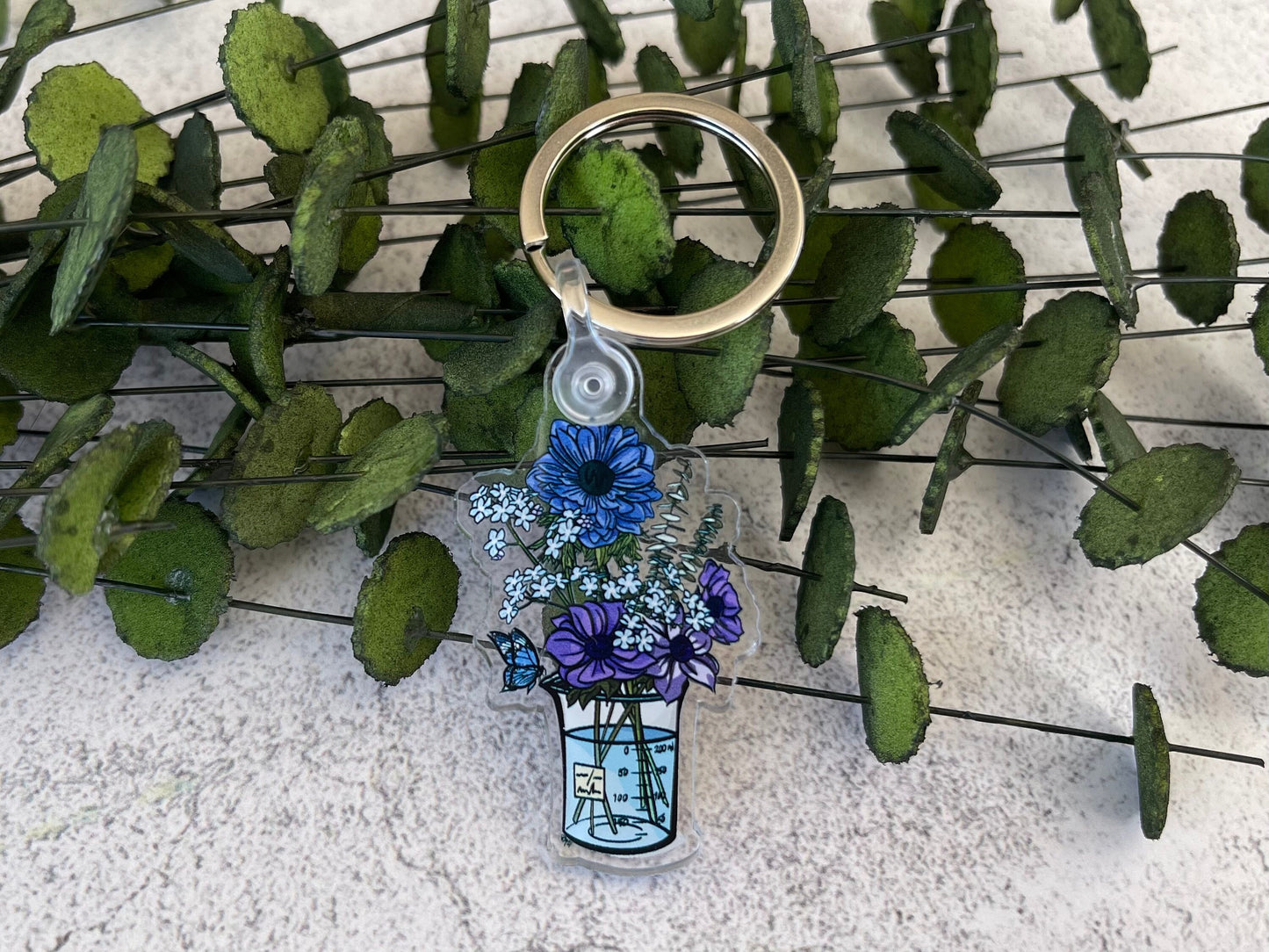 This is an Acrylic keychain of my science flask full of flowers digital painting. Perfect gift for a scientist, teacher, chemist, engineer - anyone that loves STEM or women in science. It`s got purple anemones, forget-me-nots, blue dahlia and eucalyptus.