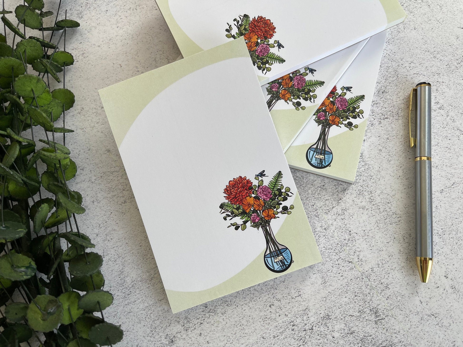 This is a notepad with 50 pages of my painting including an Erlenmeyer Flask filled with Red Dahlia, Pink Roses, Eucalyptus, California Poppies, and Ferns! If you`re a gardener, just love flowers or a scientist (or all of this combined!), this writing pad is for you! This is part of my Women in Science Collection, and there are a few others available in the set.