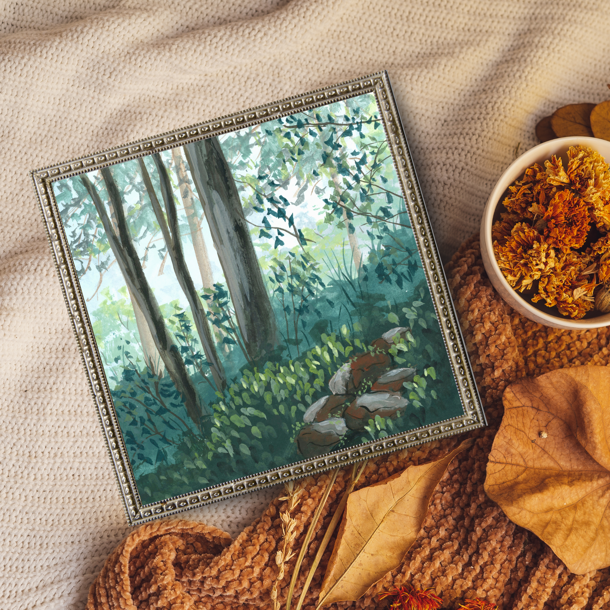 This is a Giclee Fine Art print of my hand painted gouache landscape "Rocky Woods" It depicts rocks nestled in a forest full of greenery.