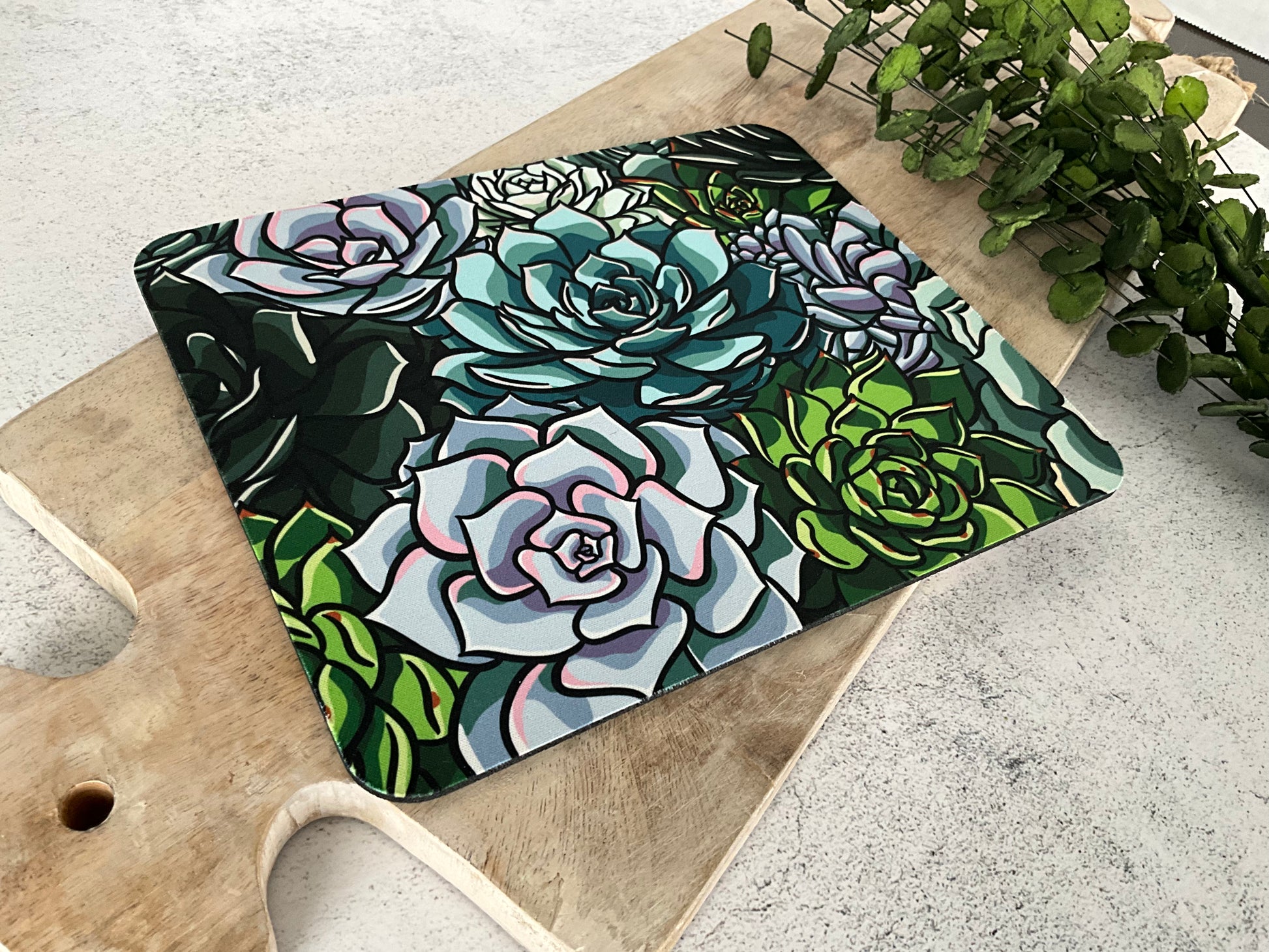 This is a vibrant succulent covered mouse pad. It's a soft texture that let's your mouse glide easily while still having a comfortable traction.