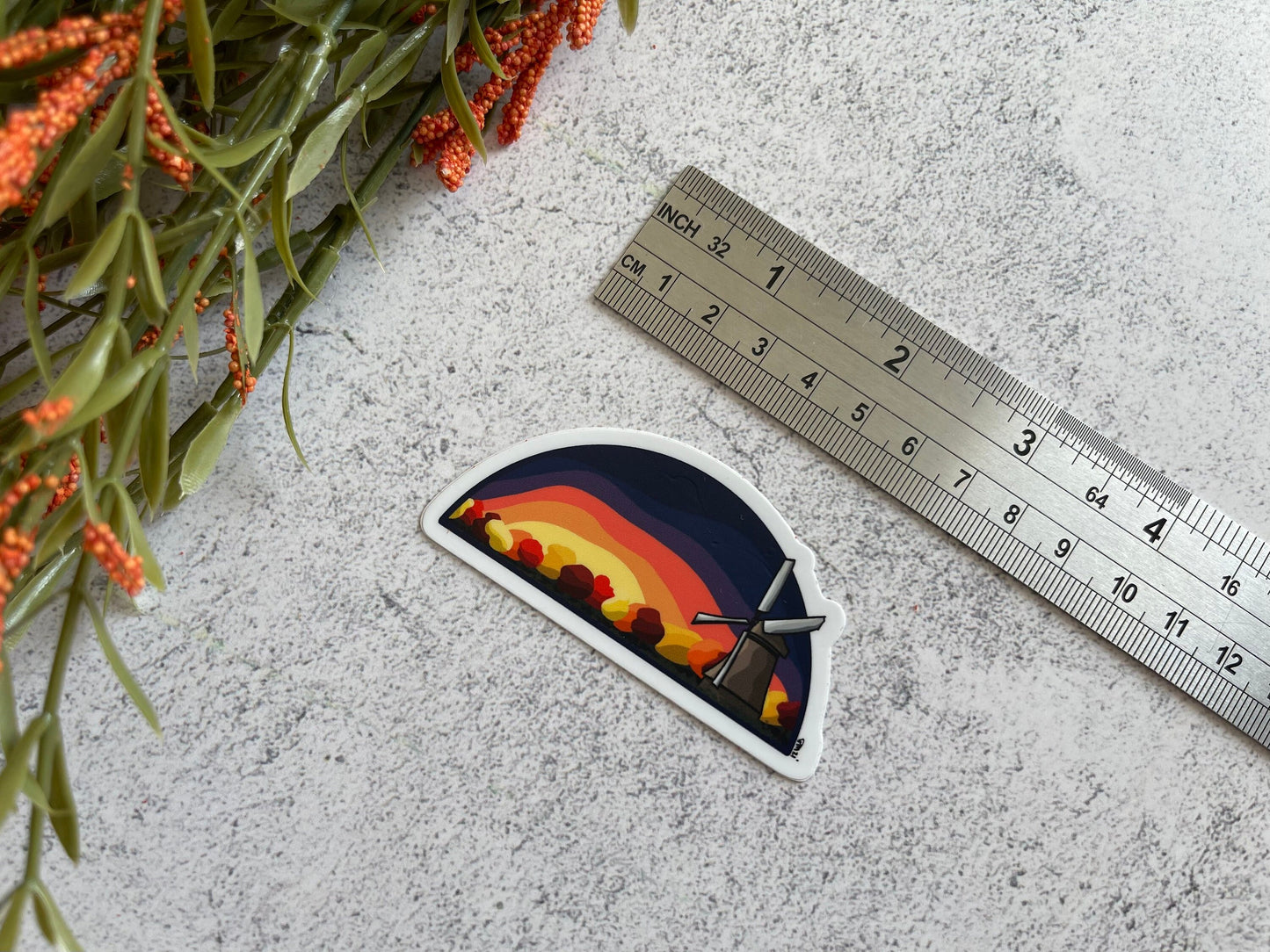 This is a sticker of my Fall Sunset Painting! If you love fall, sunsets, autumnal colored trees, and windmills - this is the sticker for you! This Sunset decal can go on anything and is waterproof as well as dishwasher safe!
