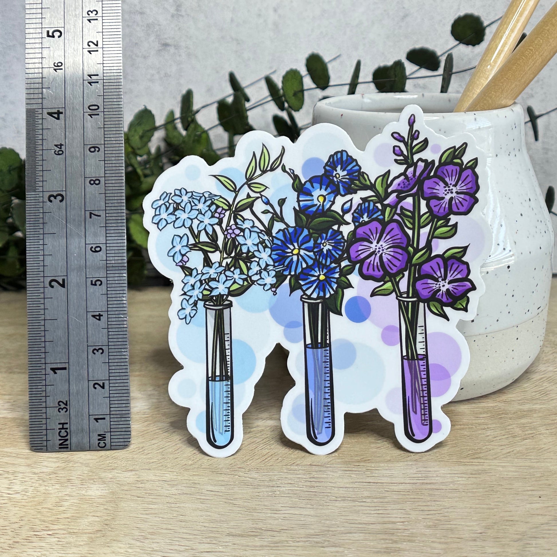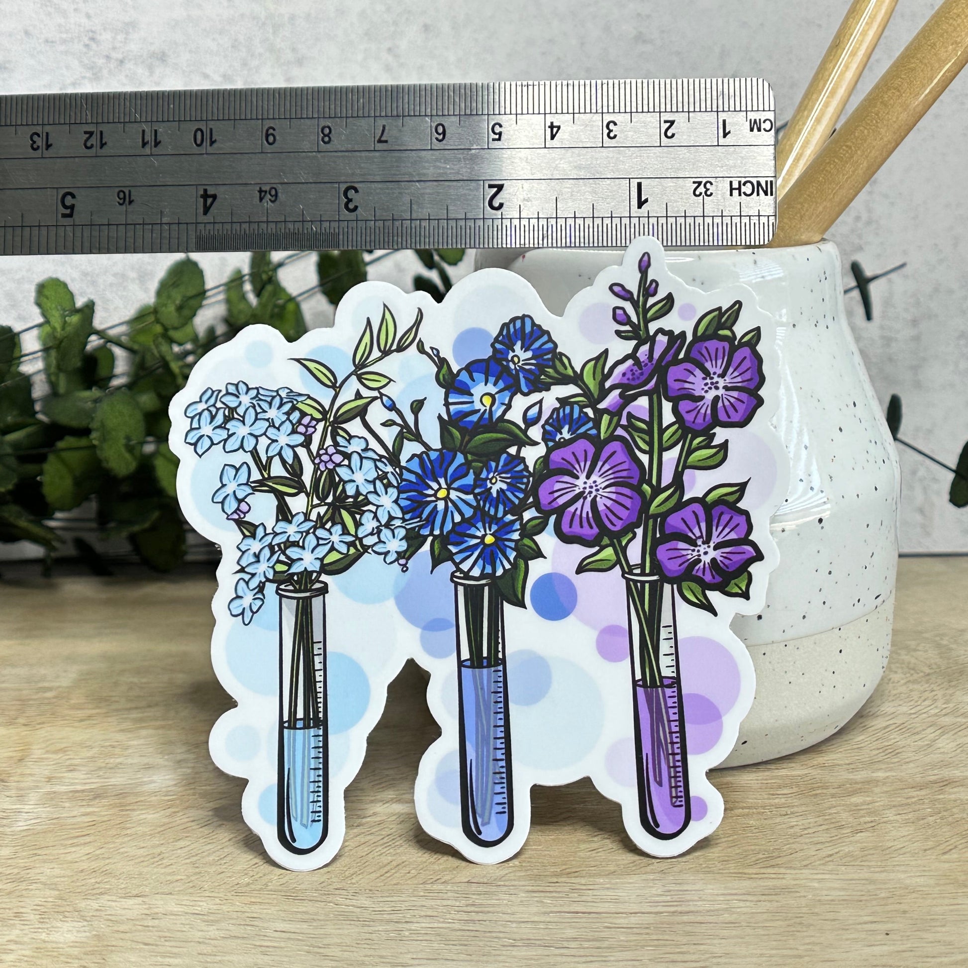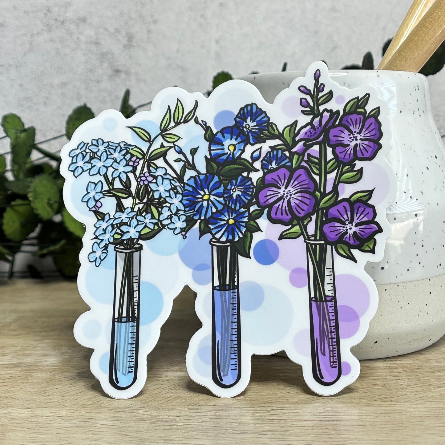 This is a sticker of my digital painting including three test tubes filled with blue, indigo and violet flowers! If you`re a scientist, gardener, or just love flowers (or all of this combined!), this sticker is for you!