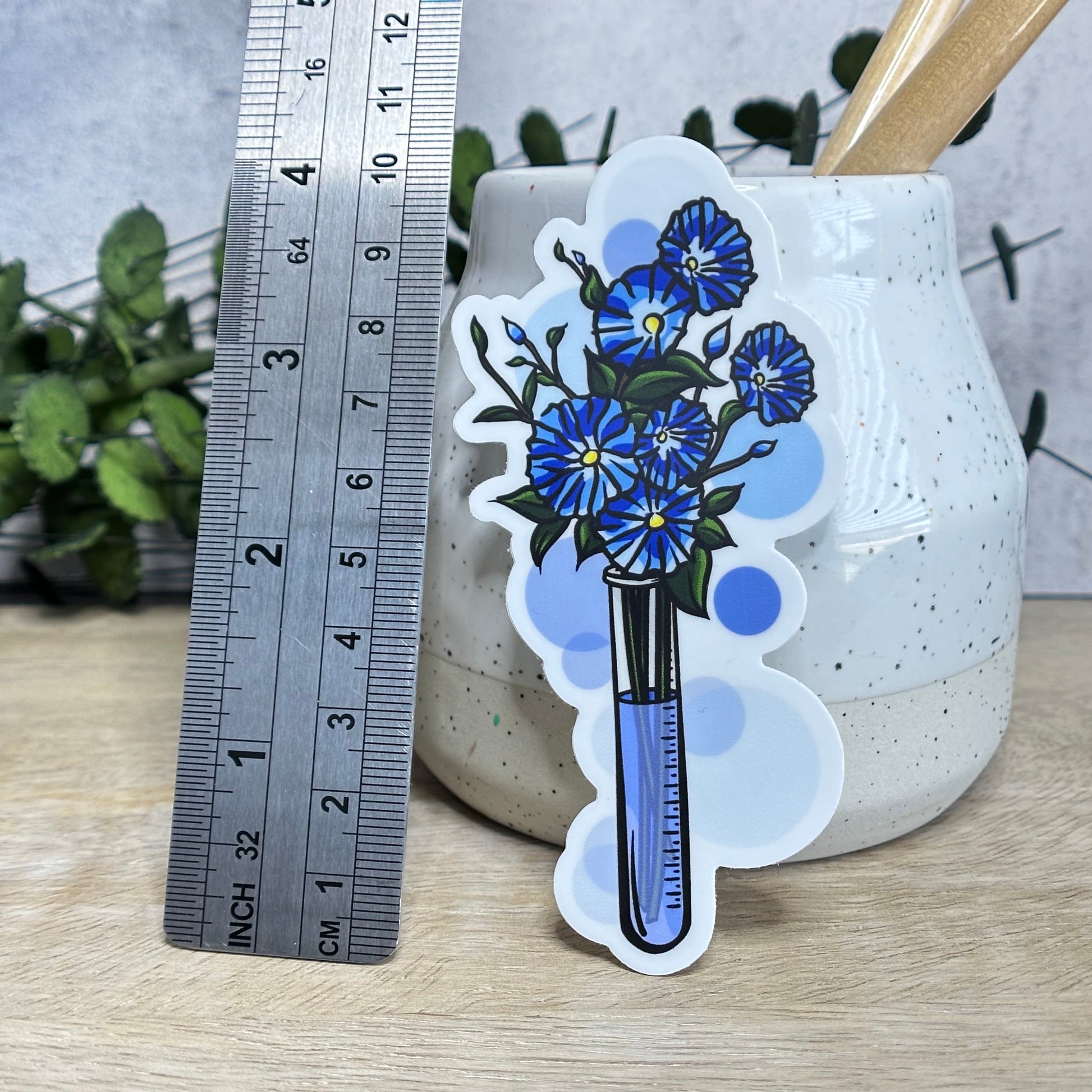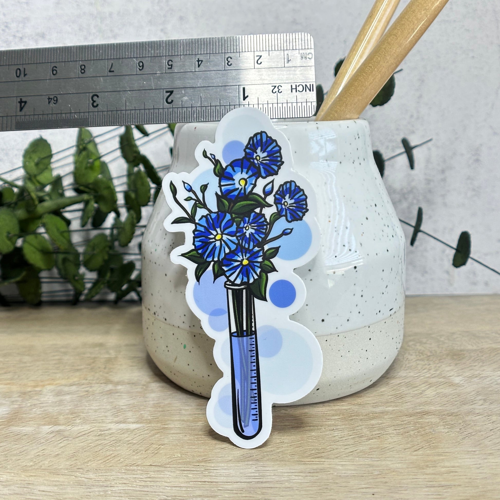 This is a sticker of my digital painting including test tube filled with indigo flowers! If you`re a scientist, gardener, or just love flowers (or all of this combined!), this sticker is for you! It comes in both clear and white backings.