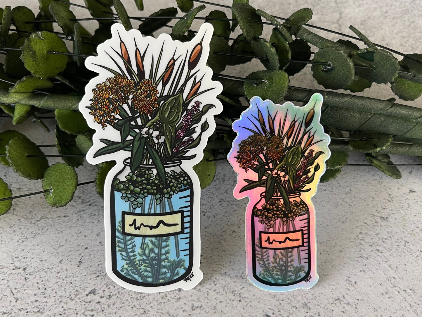 This is a sticker of my digital painting including an glass science jar filled with wetland plants! Inside the piece you will find duckweed, coontail, pink smartweed, milkweed and arrowhead! If you’re a botanist, work in a lab, a scientist, plant lover, or all of the above - it’s perfect for you!