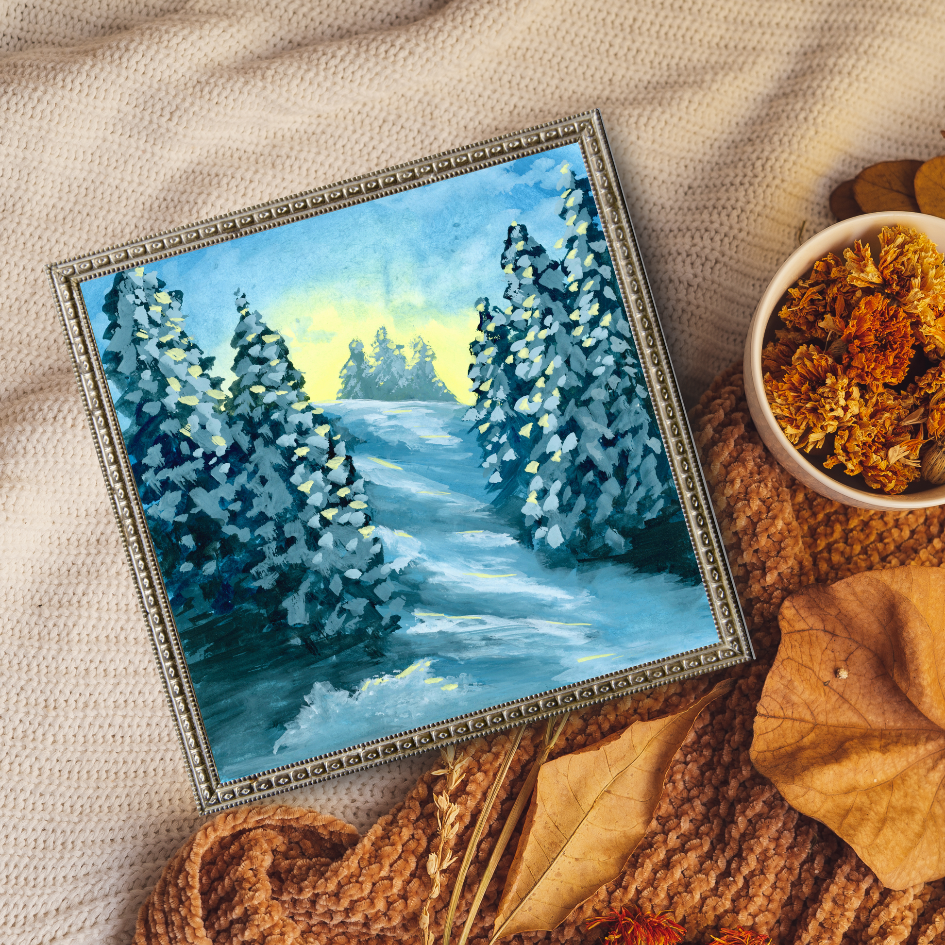 This is a Giclee Fine Art print of my hand painted gouache landscape "Winter Sunrise." It depicts snow covered pine trees catching the warm yellow light of sunrise.