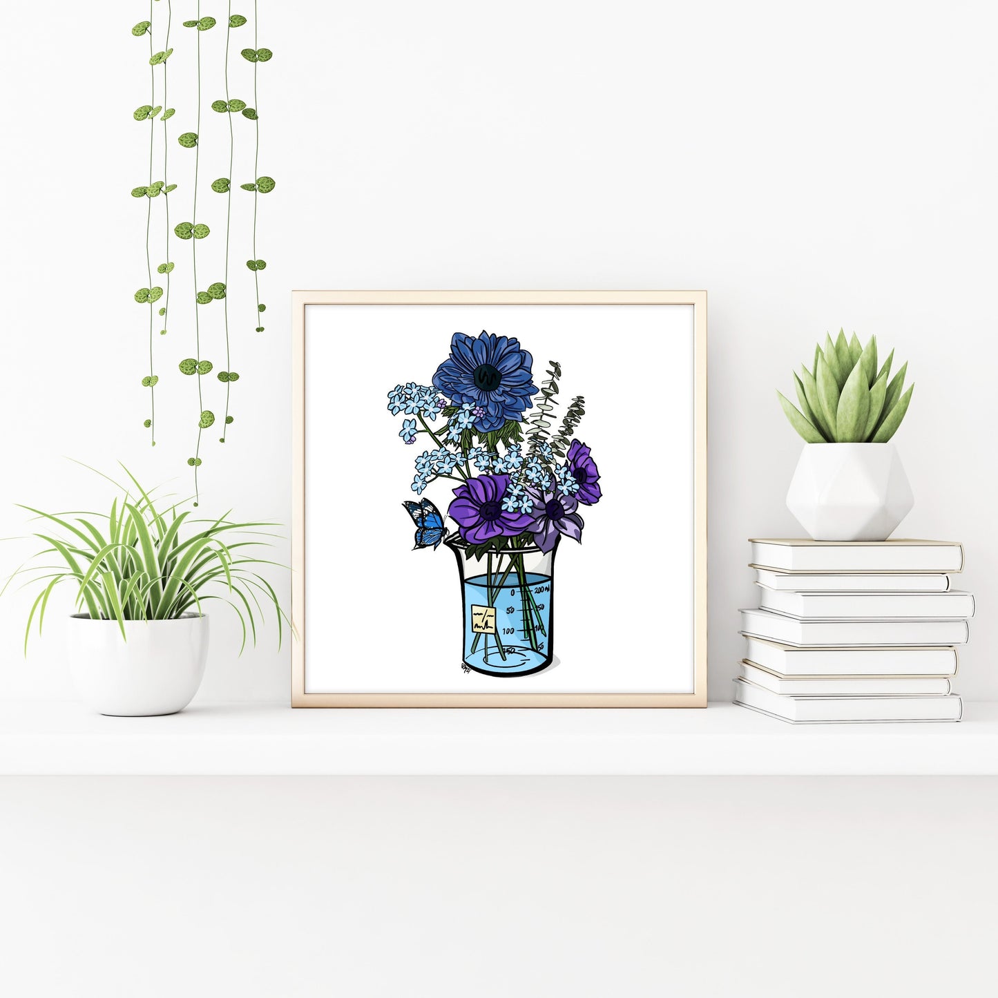 This is a set of physical print of a my Women in Science Flask Bouquet digital painting series! The first bouquet is completed with Red Dahlia, Pink Roses, Eucalyptus, California Poppies, and Ferns. The second Bouquet is made with Pink Tulips, African Violets, Daisies, and Paperwhites. The final bouquet is made with Blue Dahlia, Forget Me Nots, Purple Anemones and Eucalyptus. I try to make art that's colorful and happy. If you have a gardener in your family I'm sure these would make them smile. These would also be perfect for any kid's room if it looks like you've got a budding scientist on your hands!